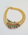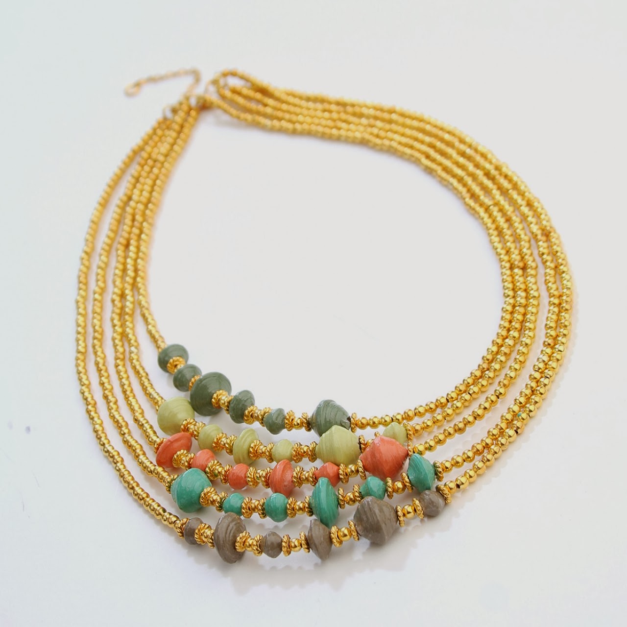 Mayla Necklace – Make a fashionable statement wherever you go! The Mayla Necklace features handcrafted beads made in Mexico from recycled paper and painted in grey, pastel green, coral, forest green, and emerald green asymmetrically strung from multiple chains of small gold beads. Pair with the Mayla Bracelet and Mayla Earrings.