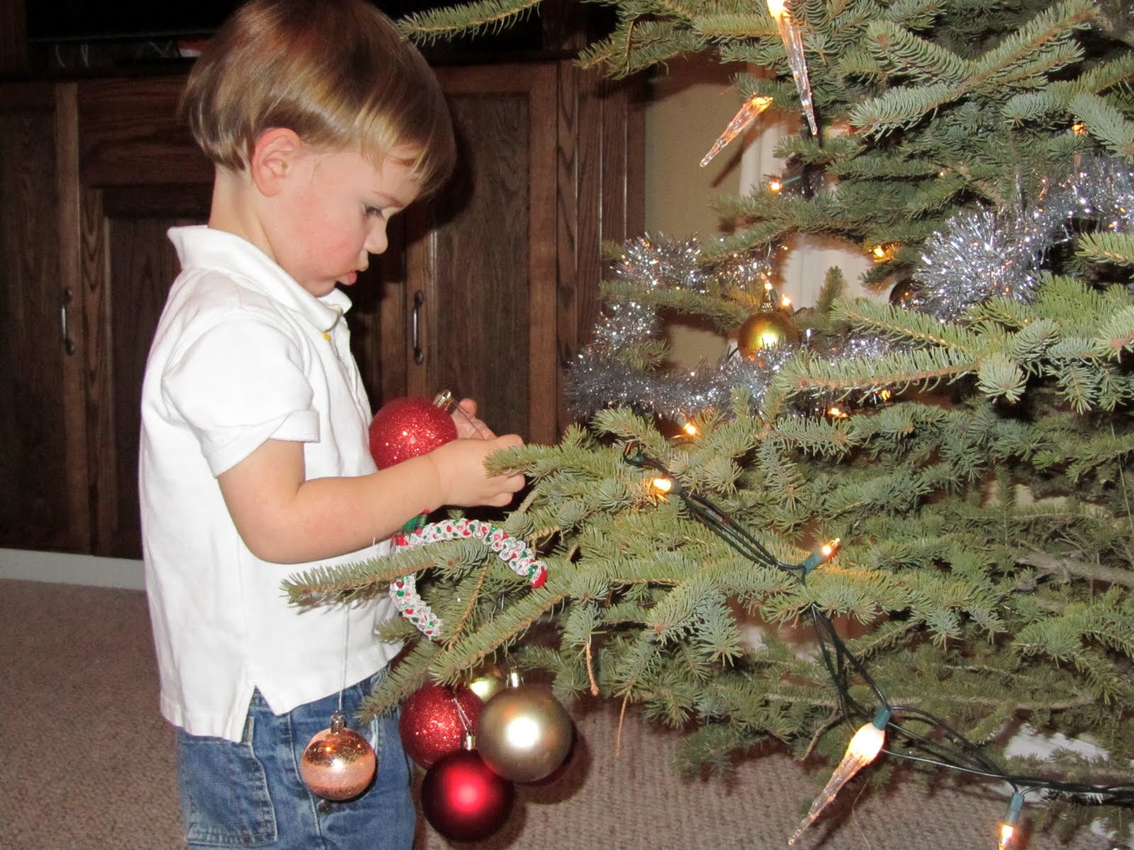 aiden is hanging bulbs, tens of them, from the same branch at the bottom of the tree and i leave them there, clustered like grapes. kasher gnaws on something on the couch and Joy to the World on the radio and trent insists we each hang our own ‘baby’s first’ ornament.