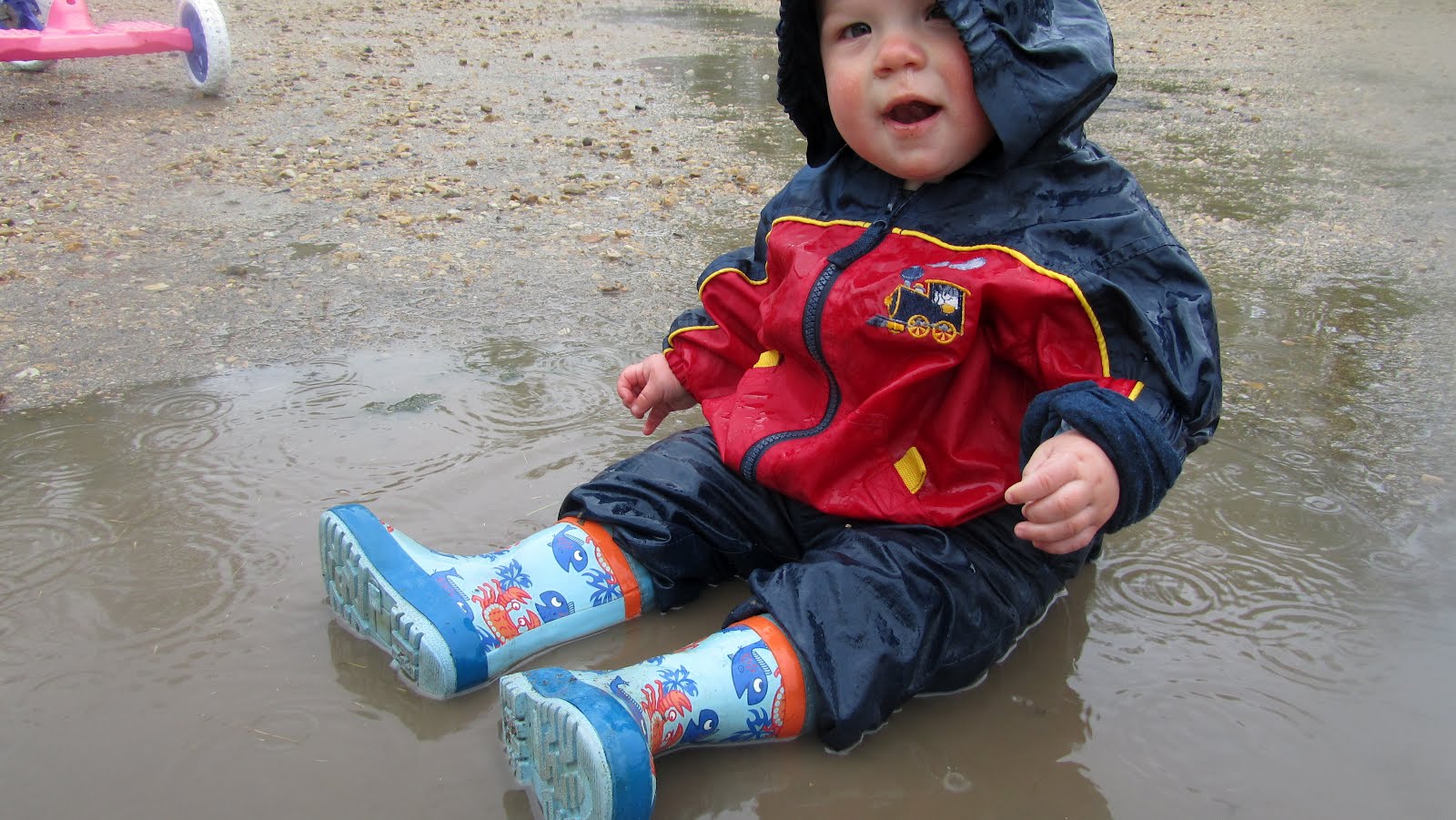 rain is good for growing things, like cucumbers and tomatoes and patience. the boys splashed in the puddles and kasher insisted on sitting plunk in the middle of one.