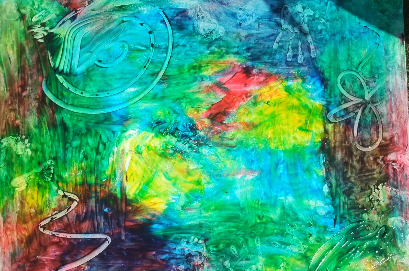 We’re finger-painting in the grass, my son and I. He’s one-and-a-half and he’s never done this before. Neither have I.
