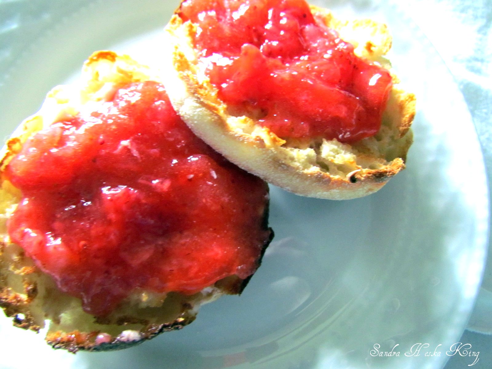 I toast a sourdough muffin golden, two halves, and slather them with butter and mounds of strawberry freezer jam.