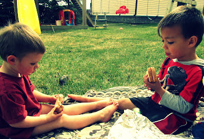 our neighbors are over, with their three children and their youngest, kasher’s age. he is chewing a cob of corn, his hair the color of the tassles, and us commenting on how big he is.