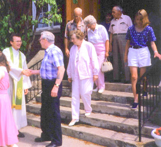 | Me descending the church steps on the right; my dad, shaking people’s hands on the left. |